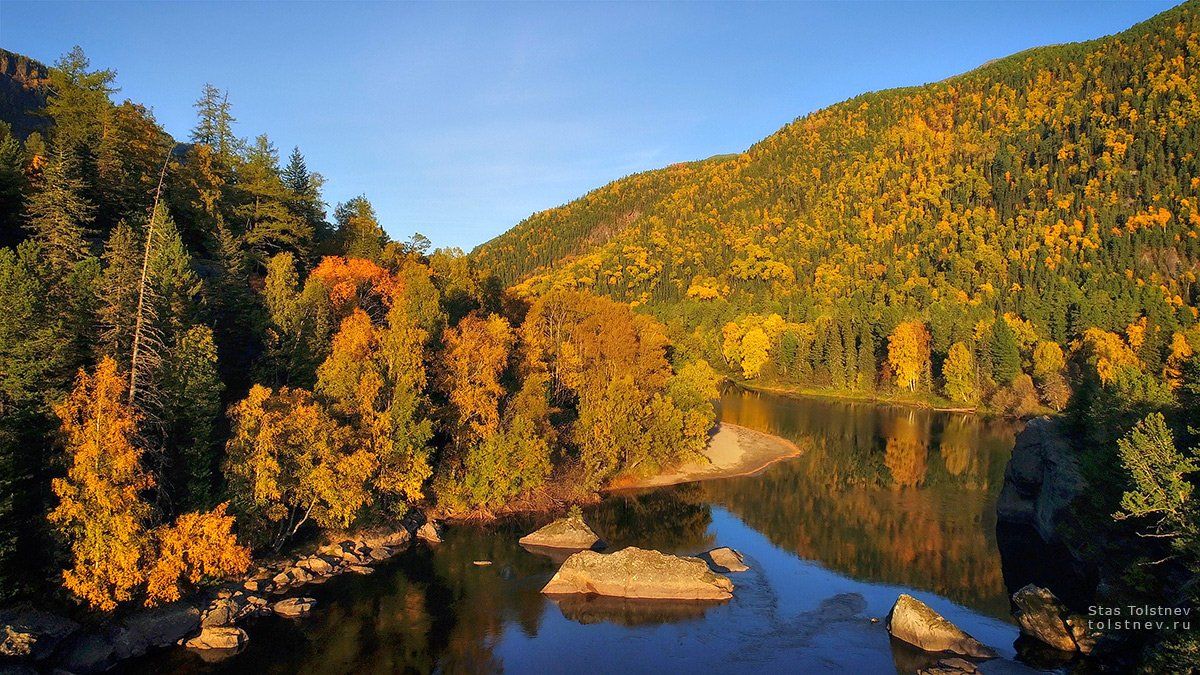 Осенний Алтай. Река Учар. Использование коптера, конечно, очень сильно расширяет возможности при съемке пейзажа. Например, этот кадр был бы просто невозможен без него.