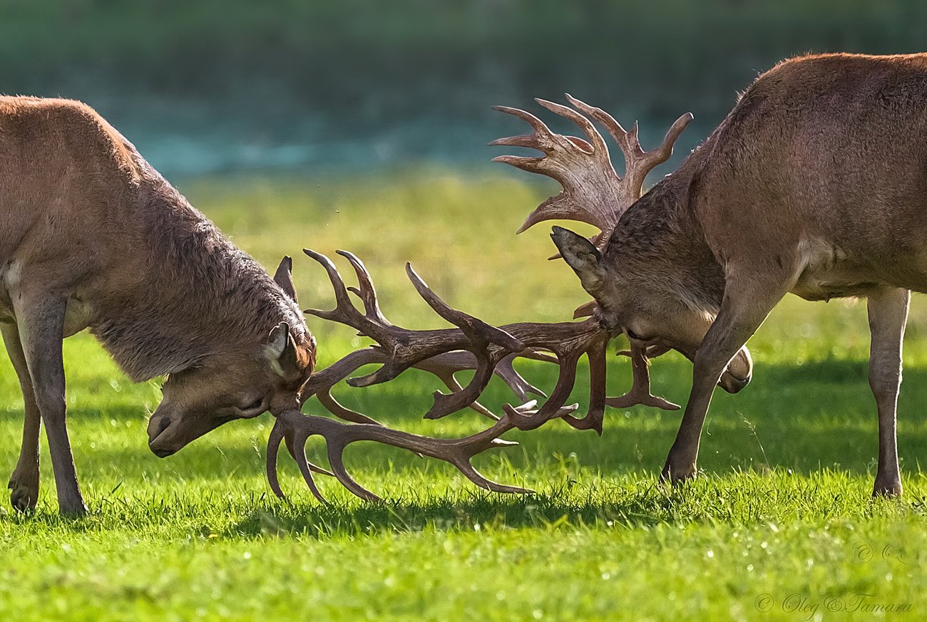 В период гона возможны драки между самцами, благодаря которым животные устанавливают первенство. Соперники сталкиваются рогами, пытаясь сбить с ног друг друга. Более слабые самцы быстро покидают поле боя. Узнать, сильный самец или слабый, можно не только по внешнему виду, но даже по голосу. У сильного и более опытного оленя голос хриплый и низкий, а у молодого и слабого — более высокий и чистый. Поединки крайне редко заканчиваются трагически, хотя бывали случаи, когда самцы ломали рога, или так переплетались ими, что не могли самостоятельно расцепиться и просто умирали от голода.