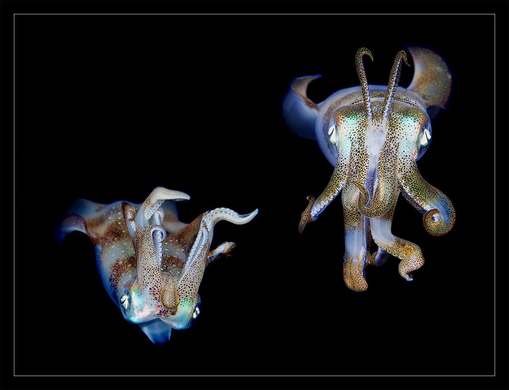 дело в том что важно какой он, этот свет - кальмары же меняют окраску подгоняя ее под окружение. Соответственно если светишь на одного желтым светом то он становиться желтым, а другой, на которго падает белый диодный свет становиться белым. В этот раз у меня был одинаковый свет и они оба стали примерно одной тональности. А тогда в Индонезии одна пыха(старый инон) светила желтым...