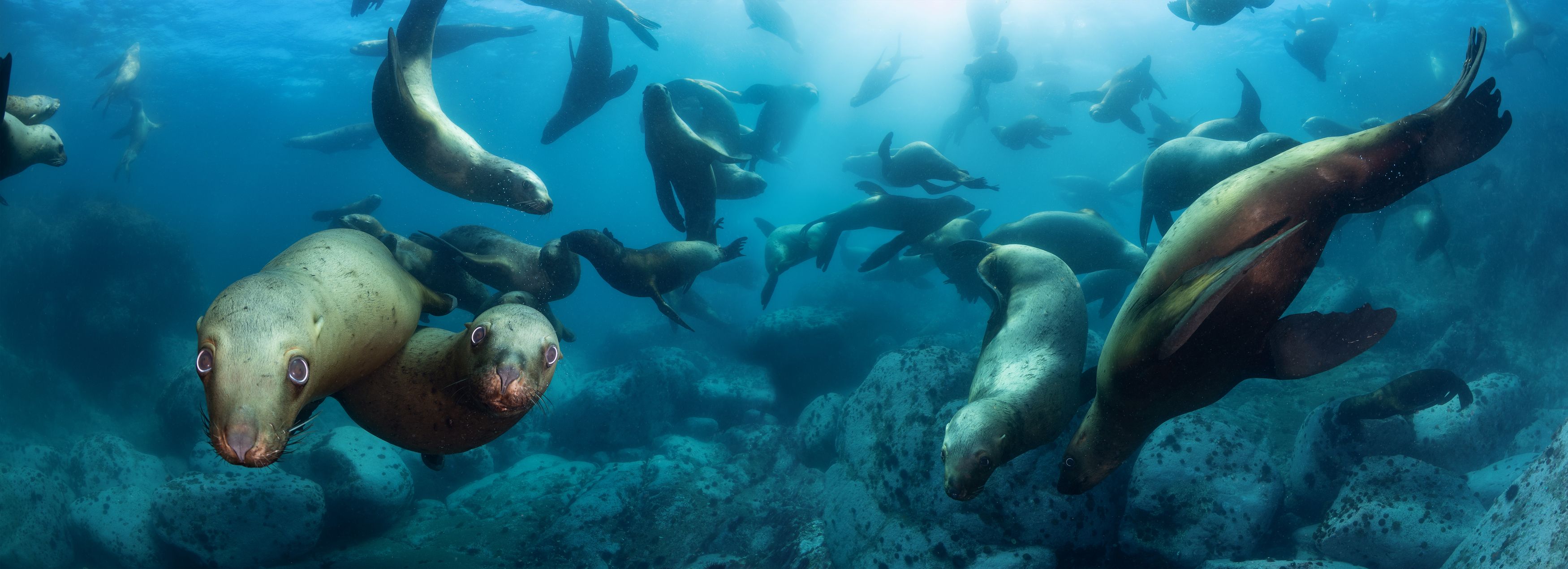 Более менее наглядно показать как выглядит под водой общение с северными морскими львами можно либо при помощи видео, либо так. Панорамой. Даже самый широкоугольный объектив (а мы снимаем обычно на фишай) не дают ощущения что ты находишься в самой гуще событий. Что животные со всех сторон.
