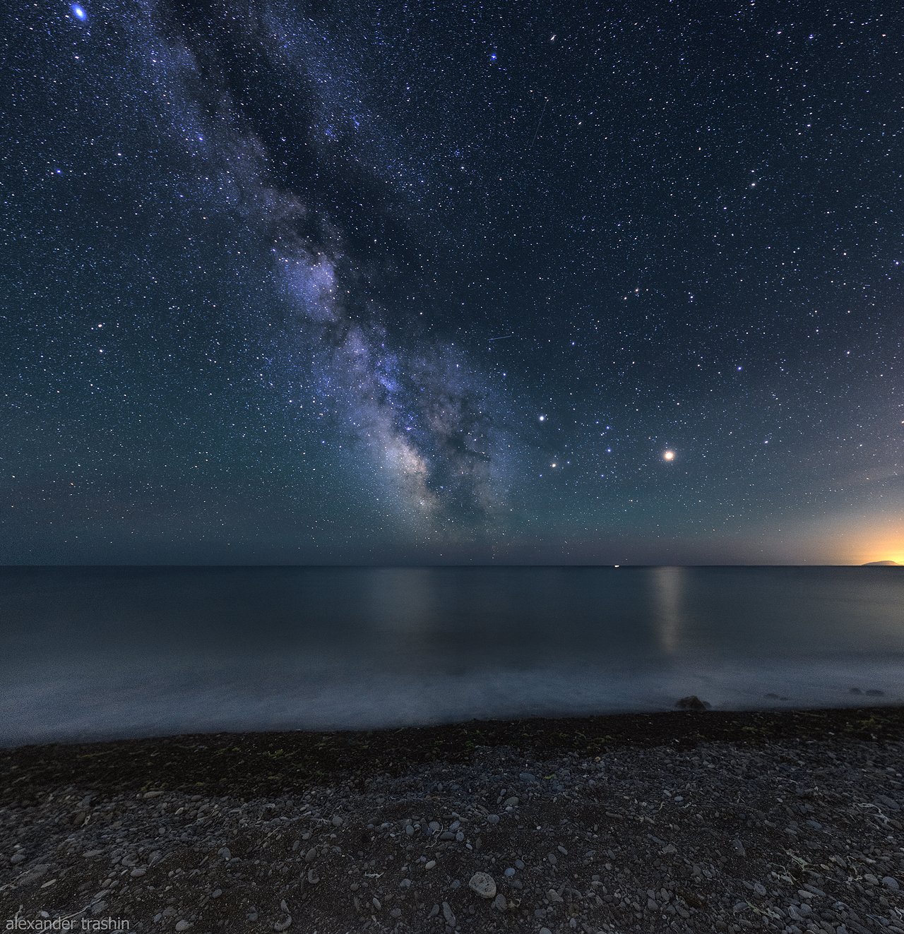 Отражения Млечного Пути, Марса и подсвеченный ночным городом скромный силуэт Аю-Дага (гора Медведь) в правом краю кадра. Пляж в Веселом, Крым.