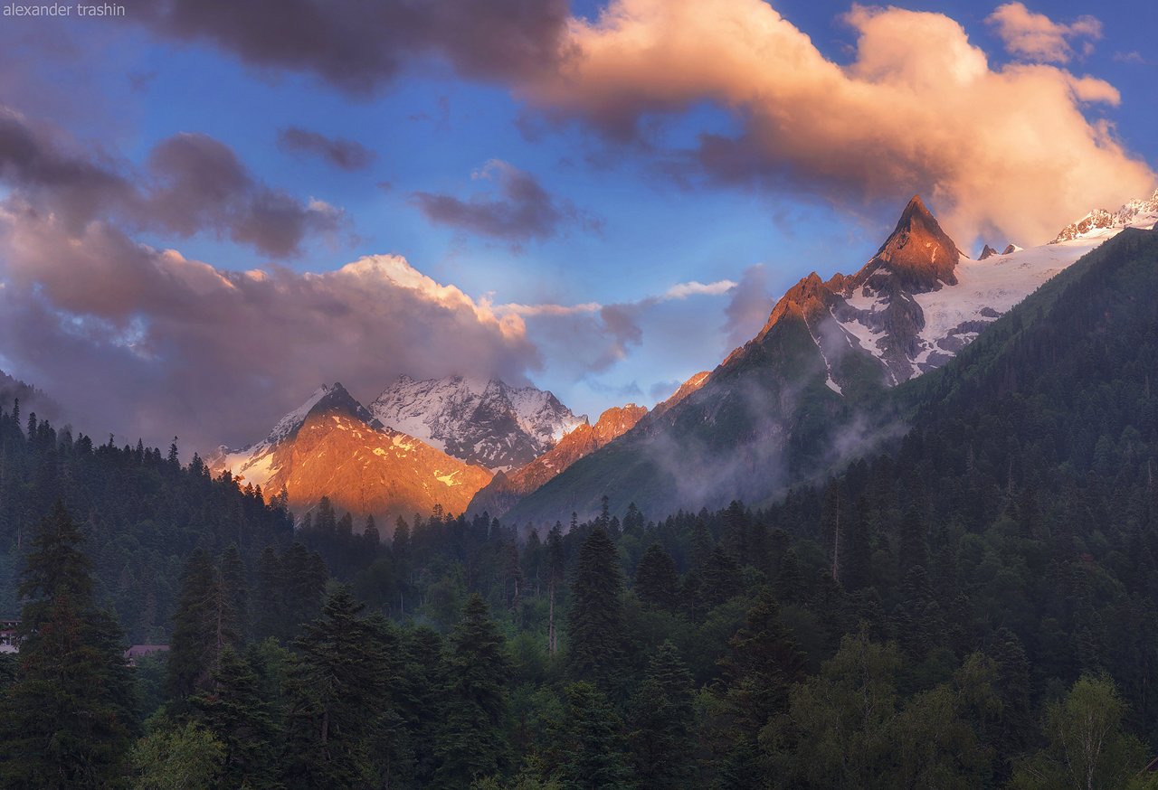 Тот случай, когда небольшой перерыв недели дождей пришёлся на красочный закат. Горный Домбай, Северный Кавказ.
