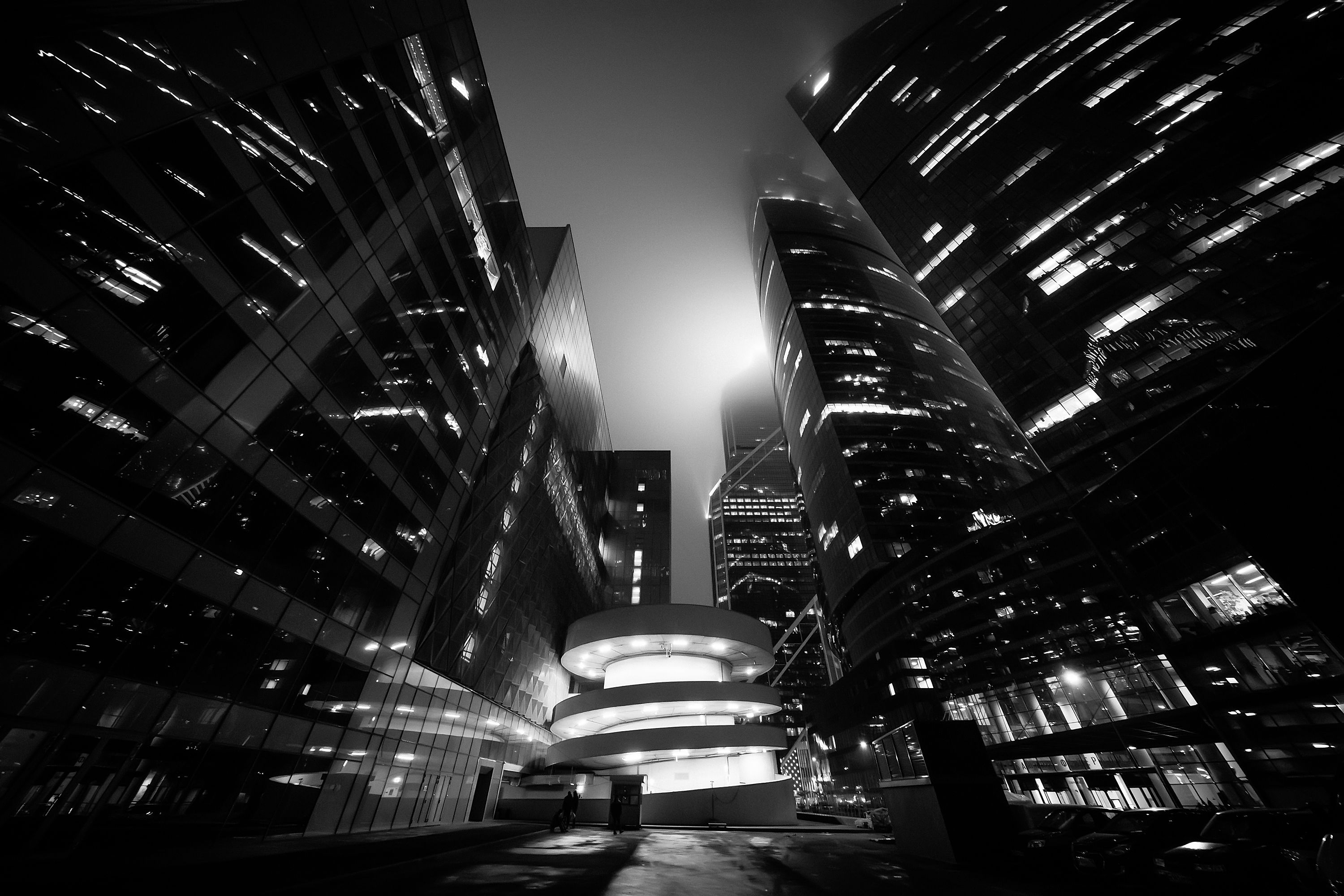 Вы использовали низкий угол и черно-белую палитру, чтобы подчеркнуть масштаб и геометрию городской среды. Центральное здание с изогнутыми ярусами выделяется на фоне стеклянных башен — хороший визуальный акцент. 🖤