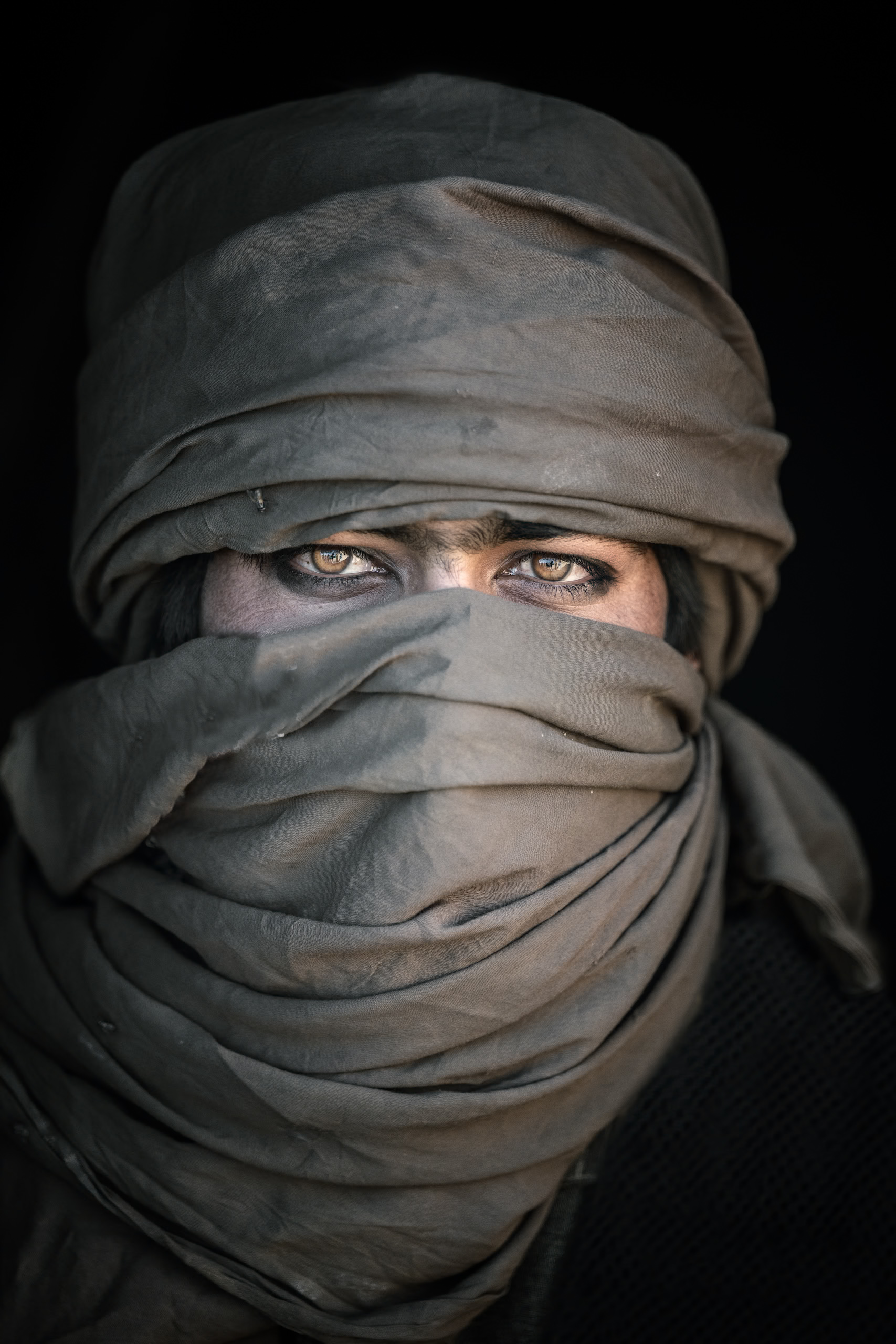 Eyes hold the storm. The cloth wraps the world away, but not the gaze.