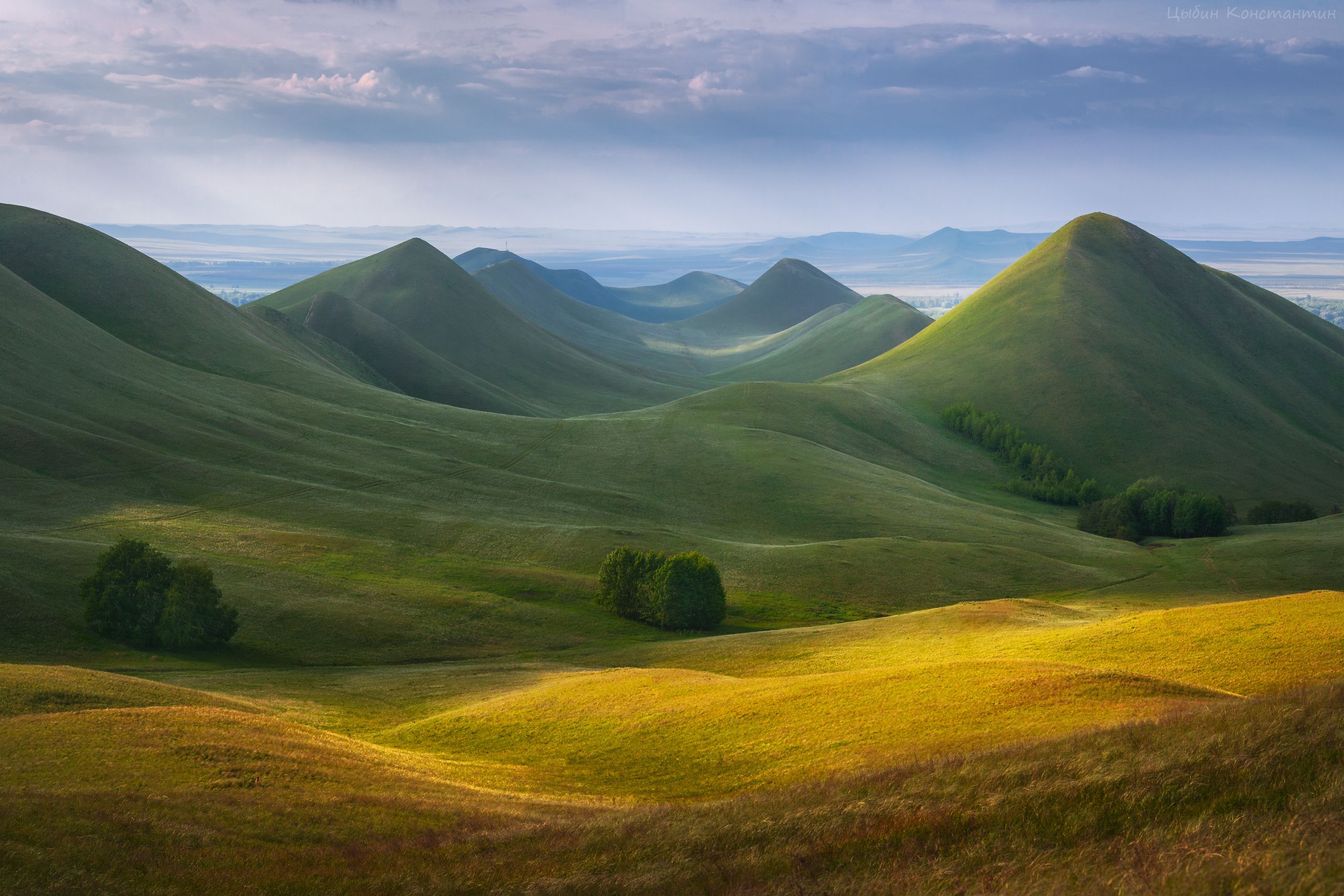 На снимке запечатлена характерная для Южного Урала ландшафтная картина — мягкие, изгибающиеся холмы, покрытые зелёной растительностью, с переходом к золотистым оттенкам в переднем плане. Небо, усыпанное редкими облаками, придаёт сцене глубину и воздушность. Фотография передаёт спокойствие и величие природы, присущее этим местам. Работа Константина Цыбина.