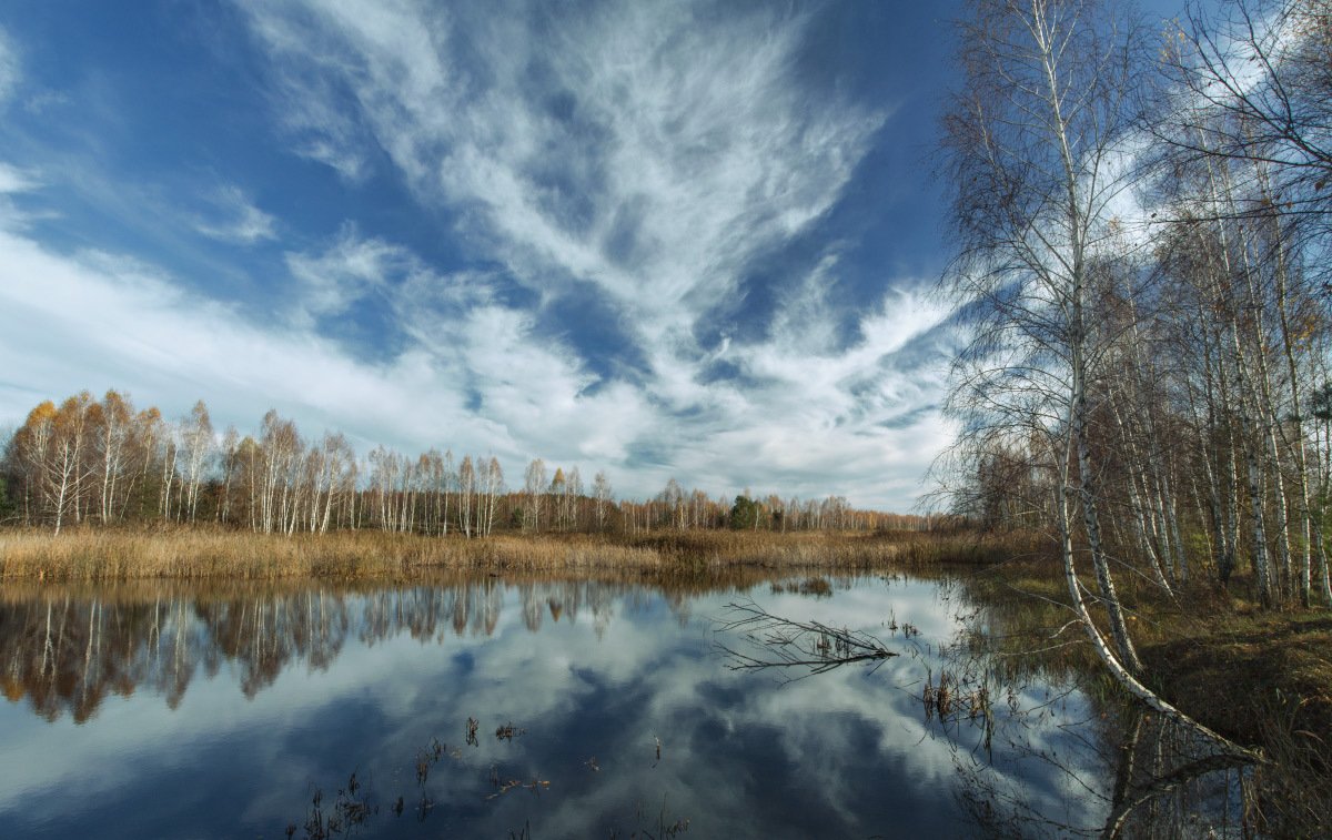 Березы, Облака, Октябрь, Осень, Отражение, Пейзж, Природа, Александр Удовиченко
