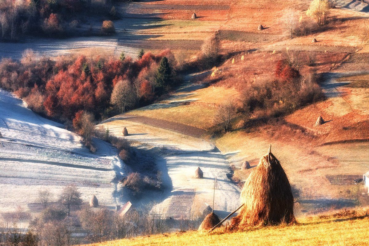 классно, цепочка стожков, длиные тени, утренийсвет, иней, мне вот только потеря деталей в светах не очень нравится, мне здесь обычно сразу минусы лепят или просто кадр не оценивают, может вас подругому оценят