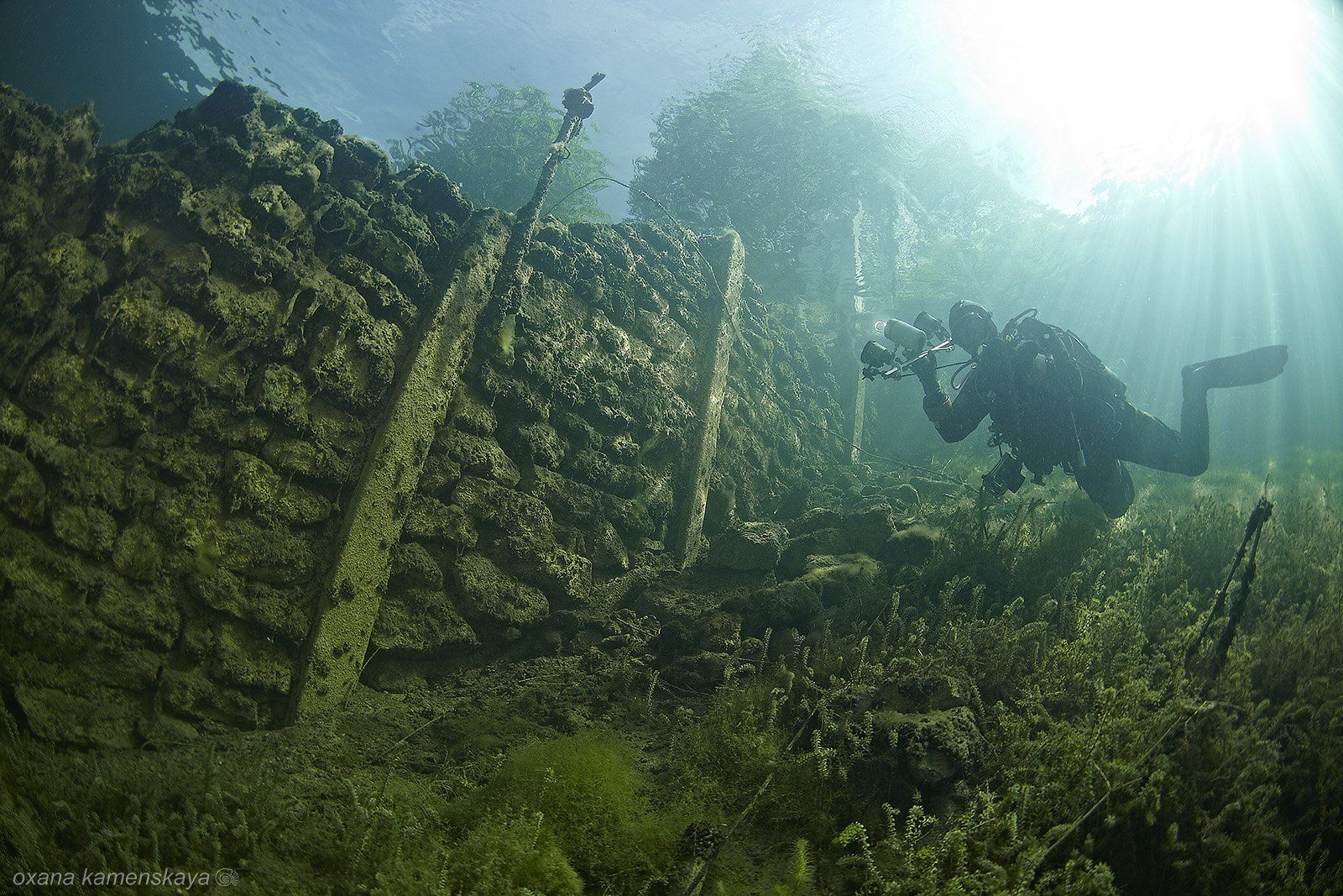 Здания затопленной тюрьмы в карьере Румму, Эстония. В 2001 году работы в карьере были прекращены, насос, откачивающий воду, остановлен. И карьер погрузился под воду, вместе с находящимися в нем: постройками, стенами с фонарями, заградительными рядами колючей проволоки, строительной техникой, вагонами и живописным лесом.