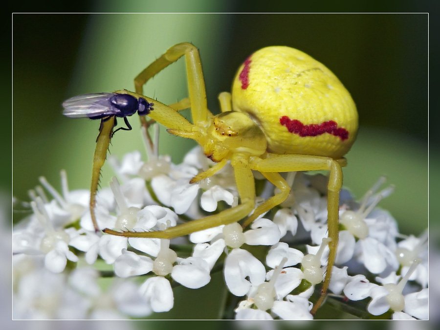 Делая этот снимок,я нечаянно задел ногой растение,на котором кем-то закусывал "Жёлтый" в компании мошек ,в результате чего паук выронил добычу с "гостями" вместе,оставшись в миг ни с чем.На снимке Вы можете наблюдать полностью обалдевшего,от неожиданности паука,в компании "охотничей" мошки. К стати,этих мошек паук не трогает,они подобно известной птичке Тарри,ухаживают за "Хозяином",который,в свою очередь делится с ними пищей,(а так,как крокодильей пасти у него нет),позволяет вылизать себя любимого после обеда.