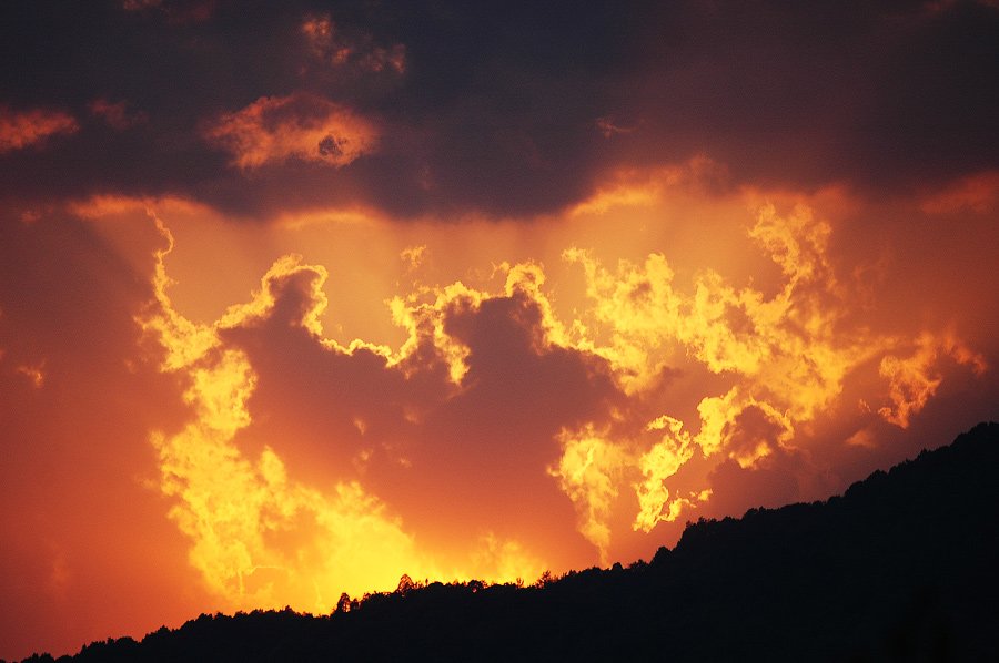 Видно, что ты снимал не просто закат, а момент, когда свет бьётся о облака — как будто небо горит. Цвета жаркие, почти огненные, и они работают. Силуэт горы внизу — хороший контраст, даёт ощущение глубины.