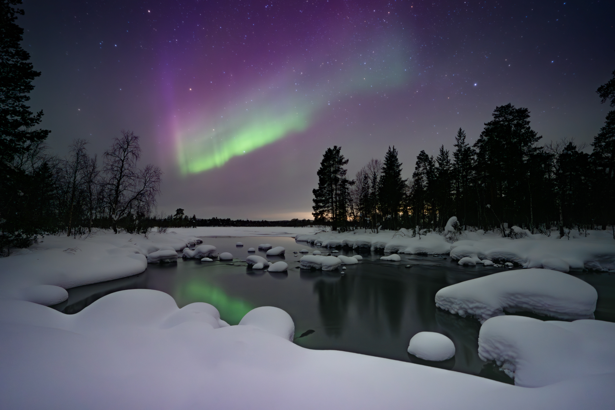 Зелёный свет северного сияния — как дыхание ночи над замёрзшей рекой.