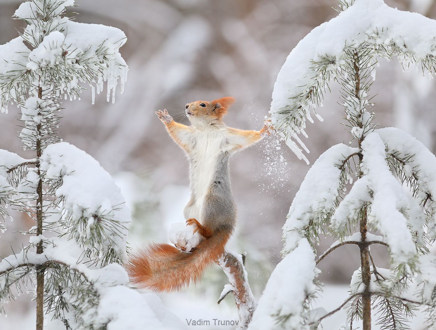 На снимке запечатлена красная белка в момент прыжка между ветвями снегозаражённой ели. Её лапы вытянуты вперёд, хвост развевается, создавая ощущение лёгкости и энергии. Замерзшие ветки, усыпанные инеем и снегом, формируют живописный фон. Фотография передаёт динамику и красоту зимней природы, застывшей в мгновении. Работа Вадима Трунова демонстрирует мастерство съёмки дикой природы в экстремальных условиях.