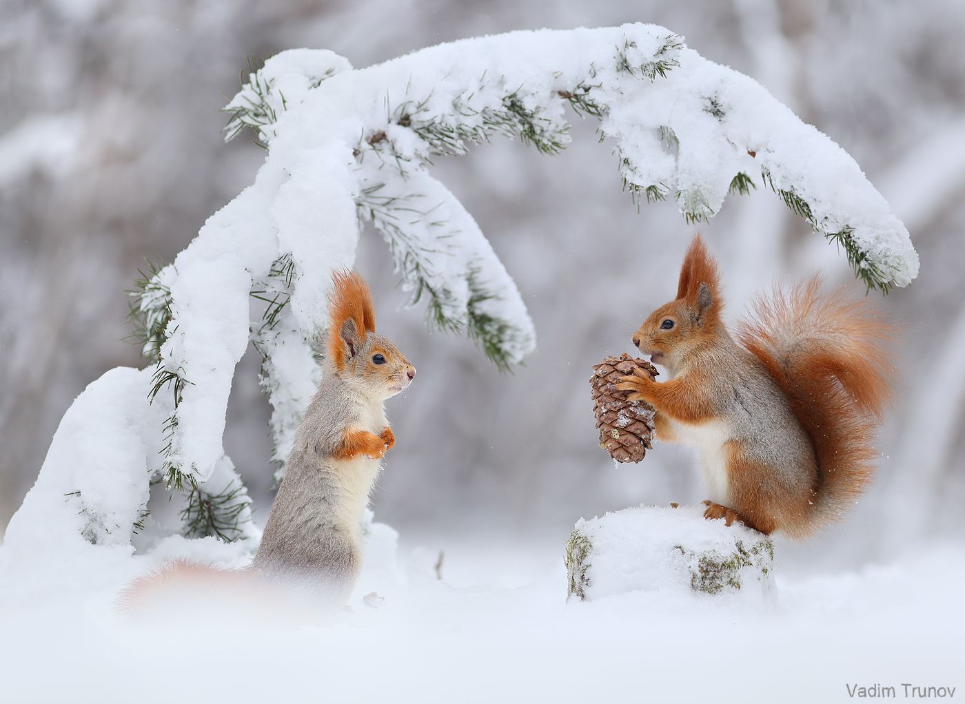 На снимке Вадима Трунова две красные белки в зимнем пейзаже. Одна, сидя на сугробе, держит шишку, другая — на фоне ветвей, усыпанных снегом, поворачивает голову. Сцена передает тишину и чистоту зимнего леса, где животные продолжают свою жизнь, несмотря на холод. Снежная ель, как арка, обрамляет момент, напоминая о волшебстве природы. Фотография — пример гармонии и естественной красоты в дикой природе.