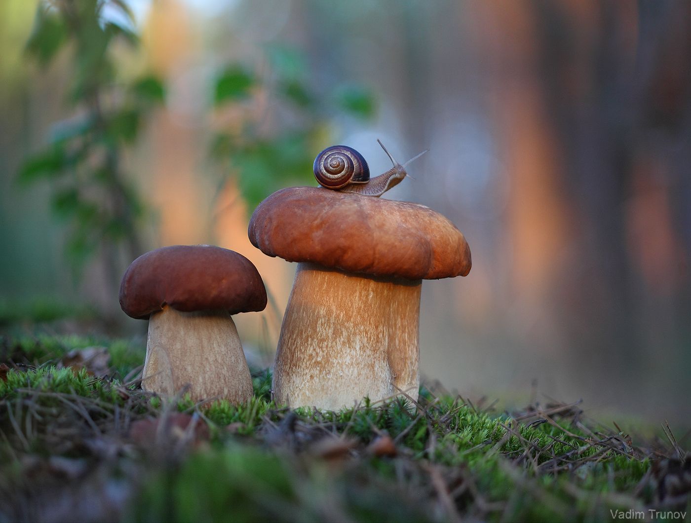В тишине вечернего леса, где солнечные лучи проникают сквозь листву, улитка покоится на шляпке белого гриба. Каждый её шаг — как акт медитации, вписанный в ритм природы. Грибы, утопающие в зелёном мху, словно хранители древних тайн. Фотограф Вадим Трунов запечатлел этот мгновенный диалог между живым и неживым, где даже маленькая улитка становится героем лесной сказки. Закат окрашивает сцену в тёплые оттенки, подчёркивая умиротворённость момента.