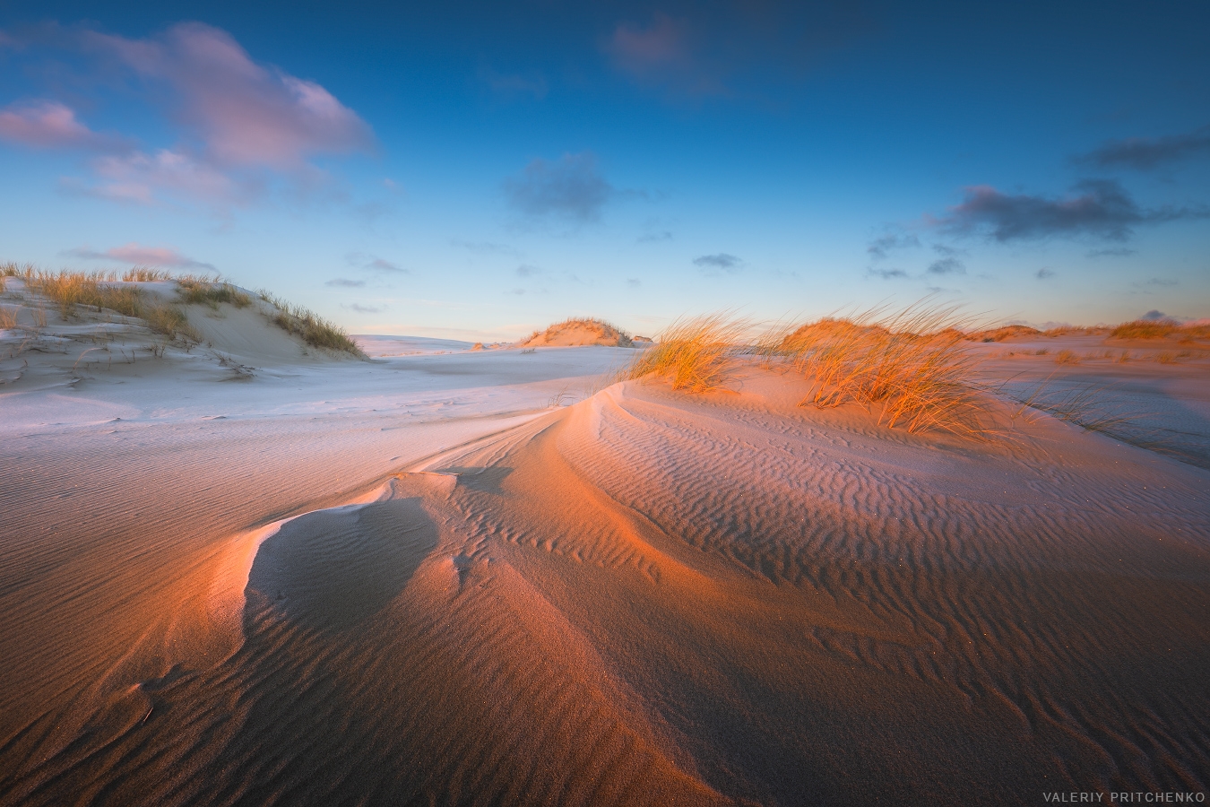 Снимок Куршской косы — чисто, сдержанно, с удачным уловом света на закате. Песчаные дюны с рельефом и тонкими следами ветра — сильная деталь. 🌅