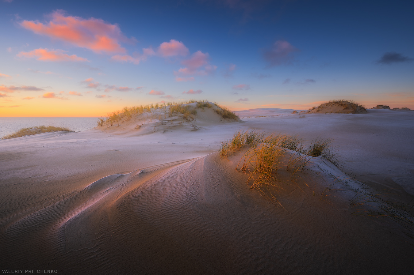 Валерий, снимок — как тихий разговор с природой. Свет утра ложится на дюны с тонкой градацией, почти незаметно переходя от розового к синему. Песок — живой, с рельефом, как старая кожа, а трава — словно последний шёпот ветра. Даже без шума чувствуешь пространство.