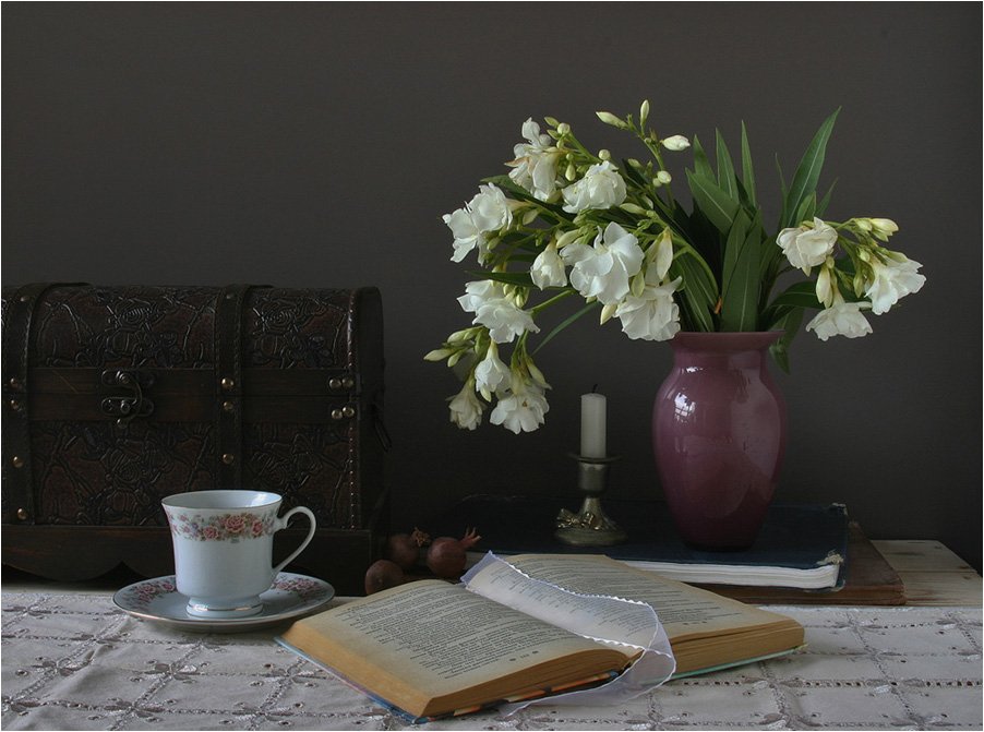На мой взгляд, кожаный саквояж (за чашкой) в этой композиции просто лишний. И ещё: по-моему, название, не соответствует...в чём тайна? Технически же работа очень хорошо сделана.