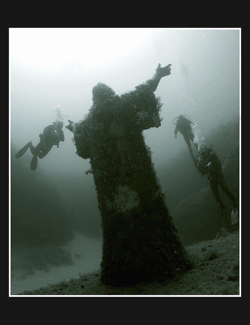 А зачем ее утопили? почему в болото не погрузили, или в землю не зарыли? Наверно, как реклама для туристов. Хотя я не христианин, но всеже не понимаю когда священные образы используют подобным образом. Ну а фото классное.