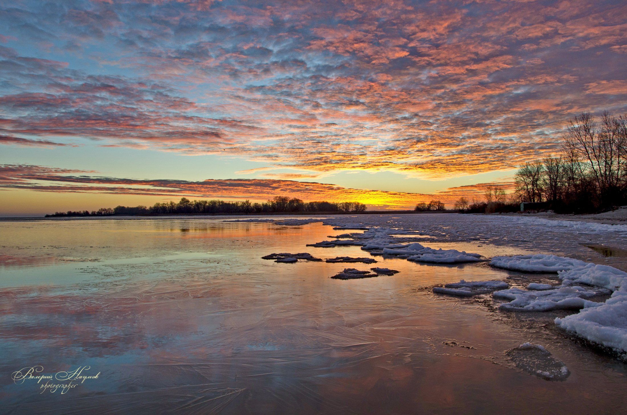 утро, рассвет, река, восход, зима, лёд, снег, отражение, Валерий Наумов