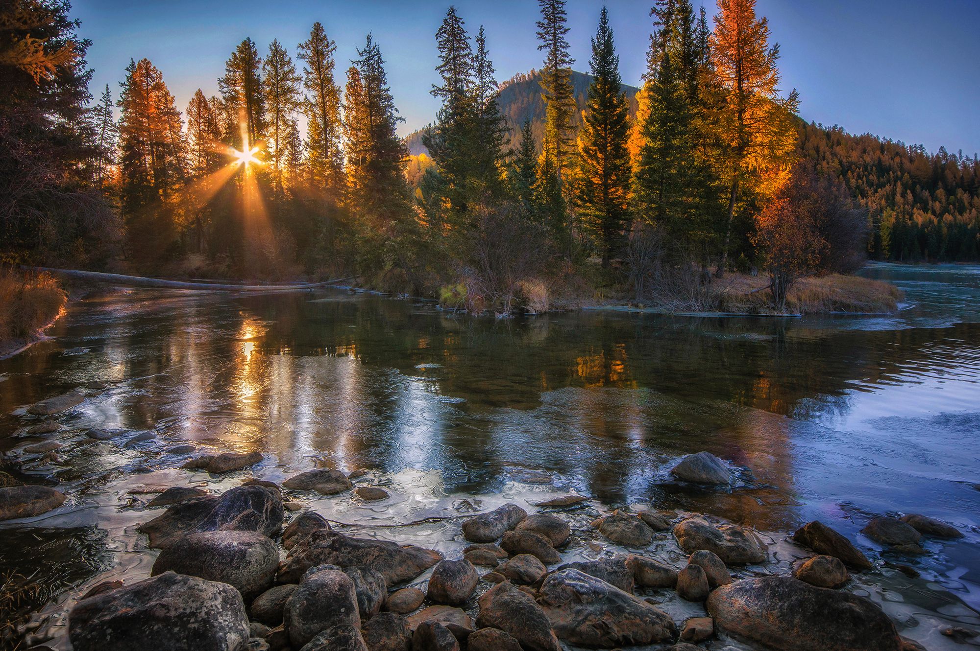 Рассвет на реке Аргут в Джазаторе — мгновение, когда свет солнца, пробивающийся сквозь верхушки елей, озаряет ледяную поверхность воды и камни на берегу. Холодный воздух, тишина и отражение золотистых лучей в воде создают атмосферу неземной гармонии. Фотограф Валерий Чичкин запечатлел эту осеннюю сцену в горах Алтая, где природа демонстрирует свою суровую красоту. Лёд на камнях, тихий ручей и тёплый свет — контраст, в котором чувствуется дыхание природы.