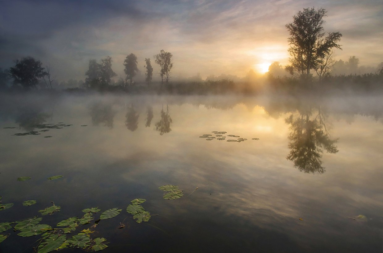 На рассвете озеро окутано легкой дымкой, сквозь которую пробиваются первые лучи солнца. Отражения деревьев в воде создают зеркальную гладь, а кувшинки на переднем плане добавляют живой акцент. Сцена передает спокойствие и умиротворение раннего утра в природе. Фотография захватывает момент, когда день только начинается.