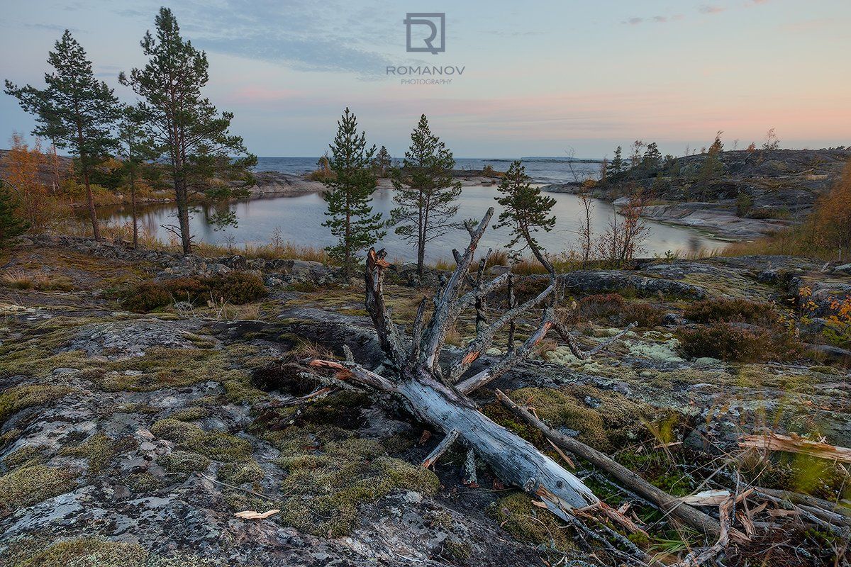 карелия россия вечер закат сосны деревья оеро ладога шхеры залив бута вода море мох скала камни, Валерий Романов