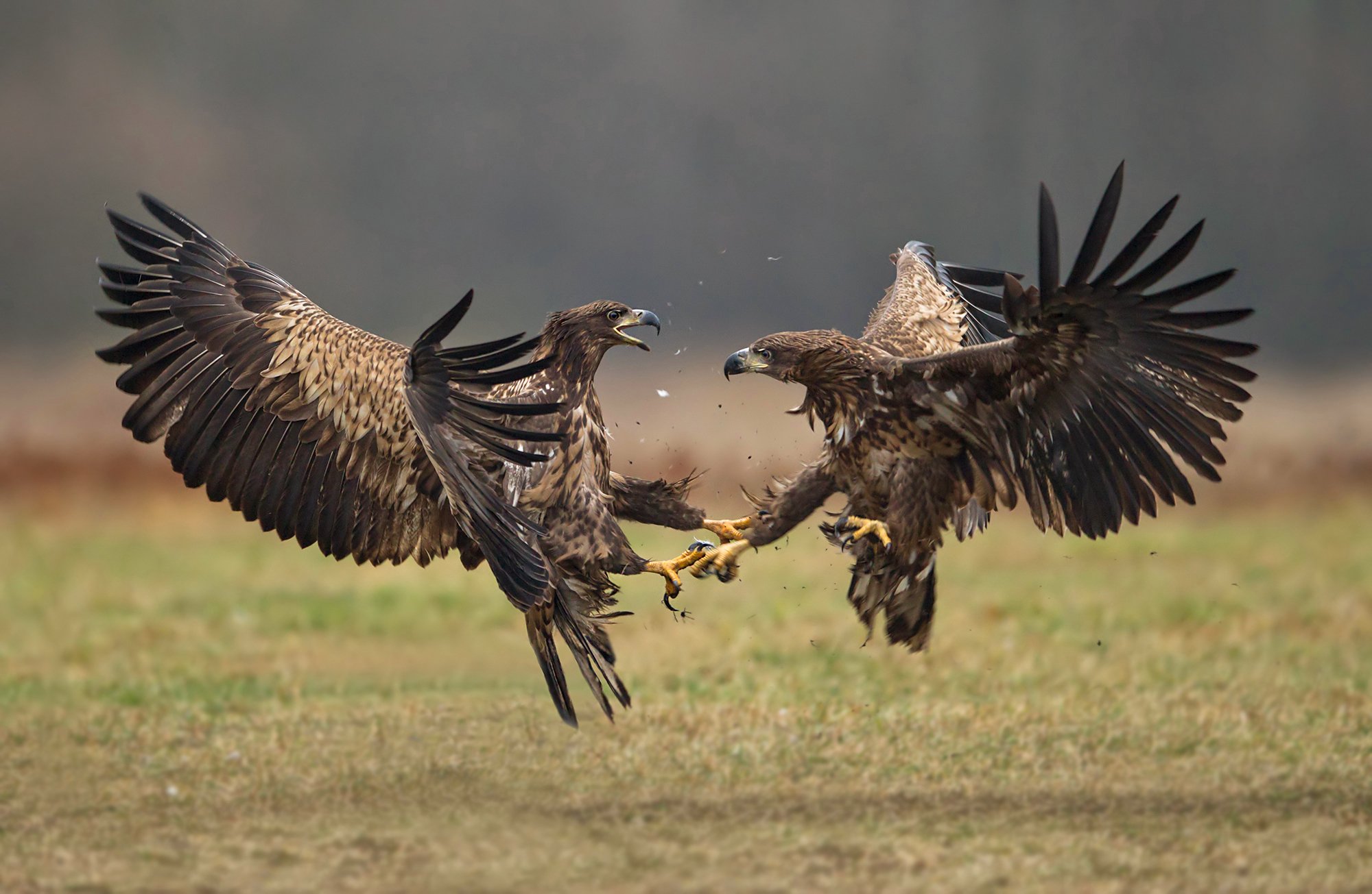 Два крупных орла вступили в ожесточённую схватку в полёте, сцепив когти и раскинув крылья. Момент застывшей борьбы за пищу — яркий пример инстинктов хищника в естественной среде. Фотография запечатлела динамику и напряжение, присущие дикой природе.