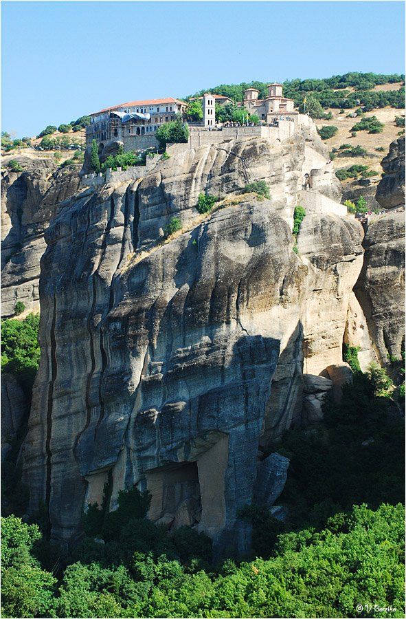 В 16 веке, во время османской оккупации, на территории Фессалиской долины православ-ные греки возвели на неприступных скалах высотой 400-500м, которые называются Метеоры, 30 монастырей (осталось 6). Причем стройматериалы, провиант и людей наверх поднимали вручную на лебедках. На снимке - монастырь Гранд-Метеора.