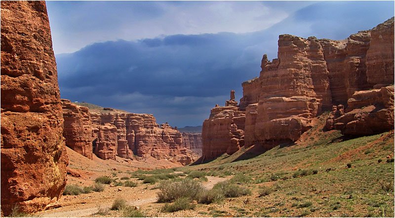 А это в мае. Обычно об эту пору уже жарища, и небо пустое, ни облачка. Но тут повезло: прошел дождь, что на Чарыне огромная редкость, и тучами заволокло. Спасибо.