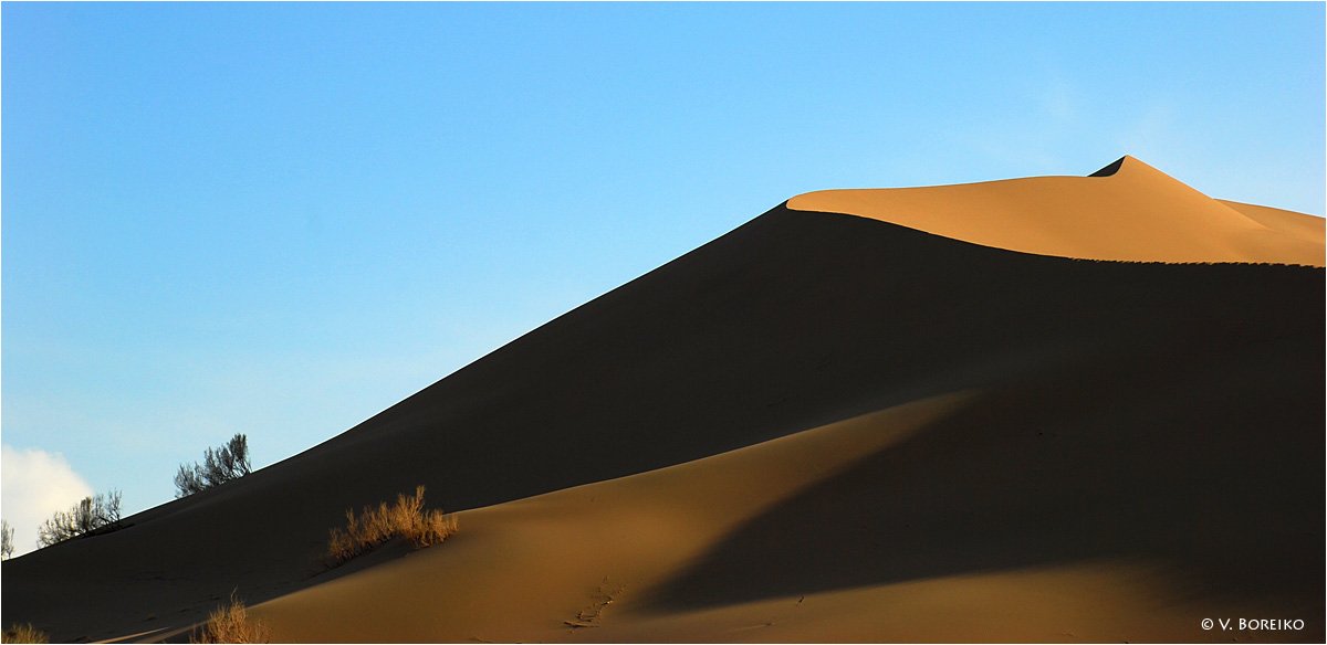 В национальном парке Алтын-Эмель (см. предыдущие работы). Бархан выходит прямо на реку Или. Пилить на восток от Алма-Аты 250 км.