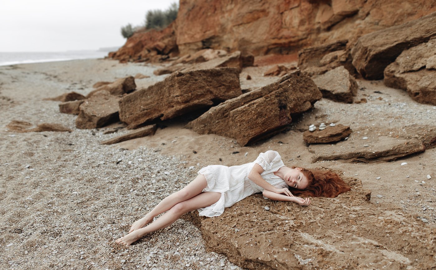 На берегу, где море встречается с суровыми красными скалами, девушка в легком белом платье лежит на камне, словно часть ландшафта. Её поза — естественна, расслабленна, почти медитативна. Фотограф Игорь Бурба запечатлел момент глубокого единения с природой, где тело человека становится продолжением земли. Свет мягкий, погодные условия — облачные, что усиливает атмосферу тишины и уединения. Это не просто портрет — это поэма о гармонии, о том, как человек может быть частью природы, а не её противопоставлением.