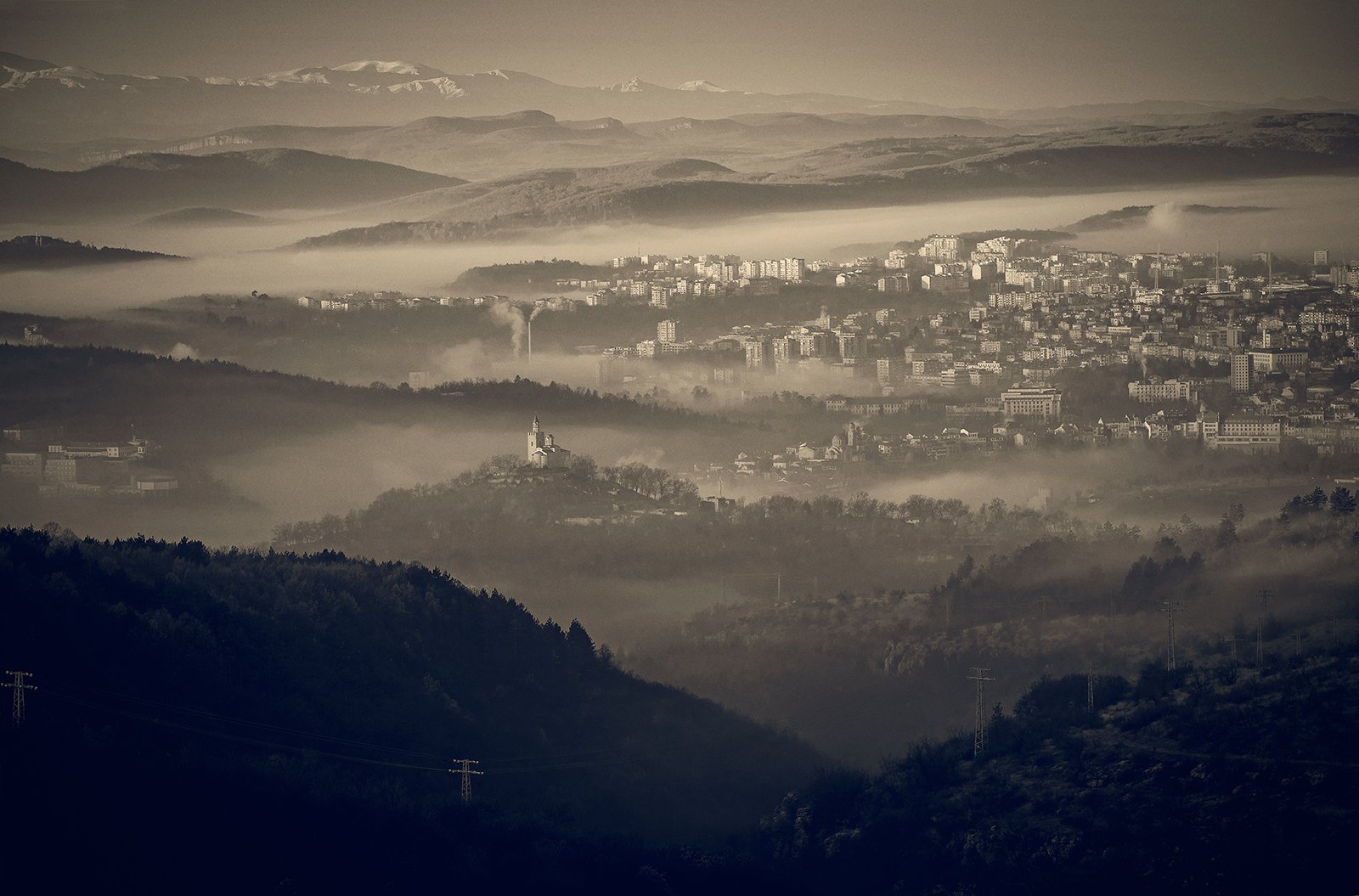 landscape, fog, church, tower, hill, пейзаж, церковь, город, холм, мгла, башня, Венци Йорданов