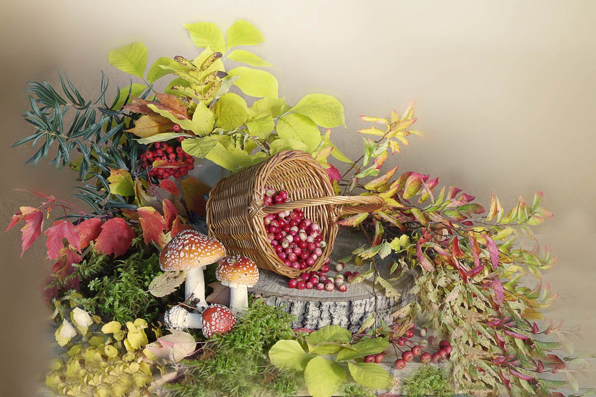 Клюква, Листва, Мухоморы, Натюрморт, Осень, Вера Павлухина