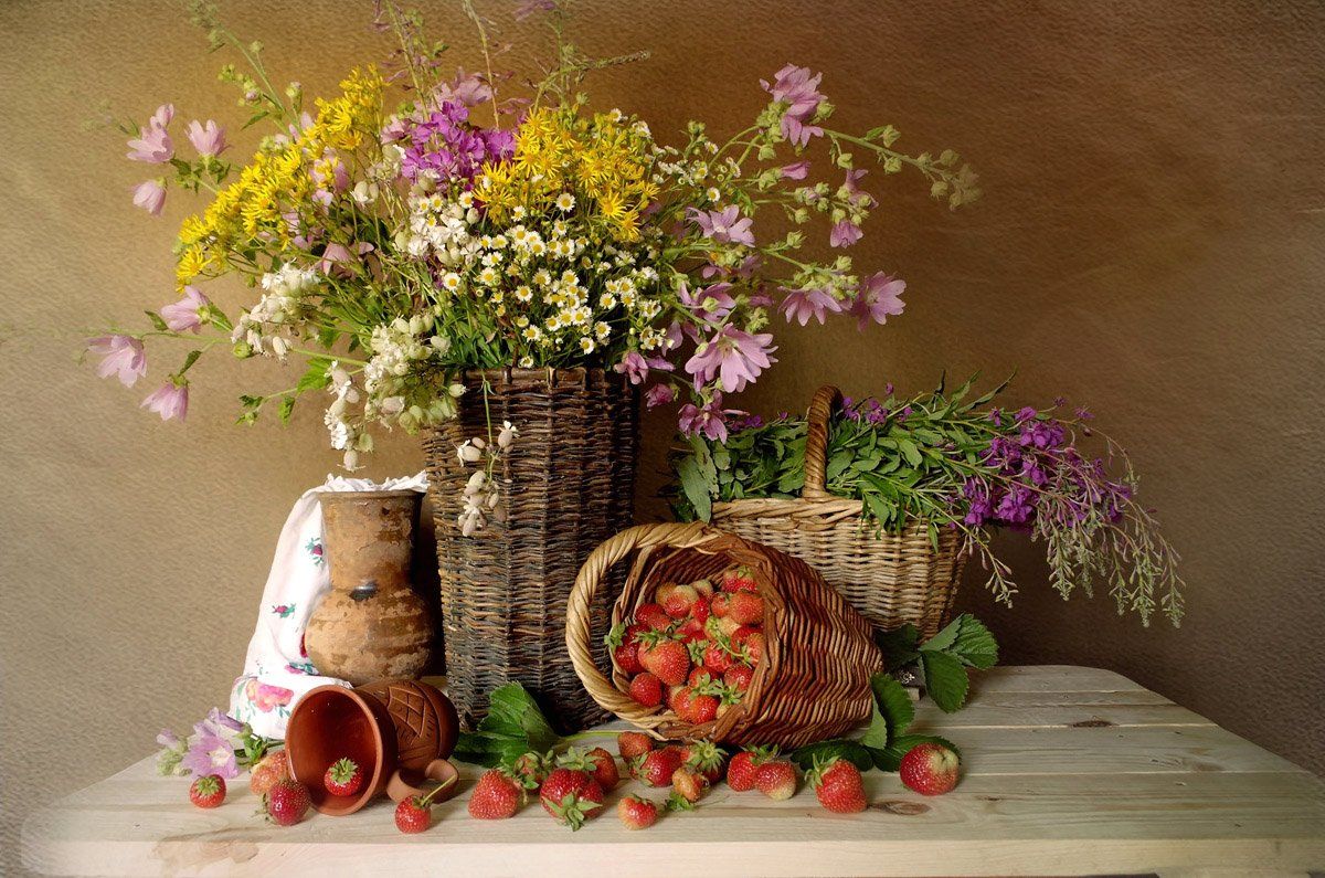 Букет полевых цветов, Живые цветы, Изделия из глины, Клубника в карзинке, Красивые цветы, Натюрморт, Плетеная корзина, Спелая клубника, Вера Павлухина