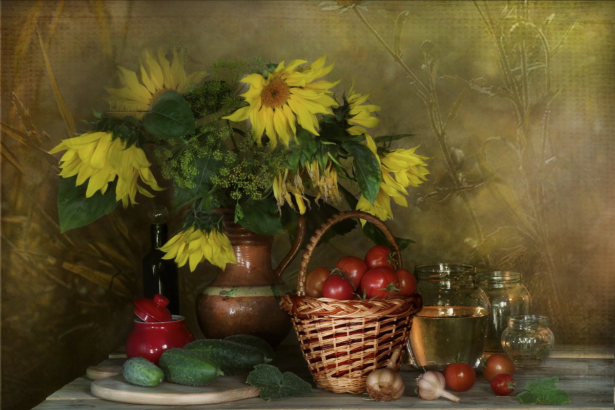 Овощи, Огурцы, Подсолнухи, Томаты, Чеснок, Вера Павлухина