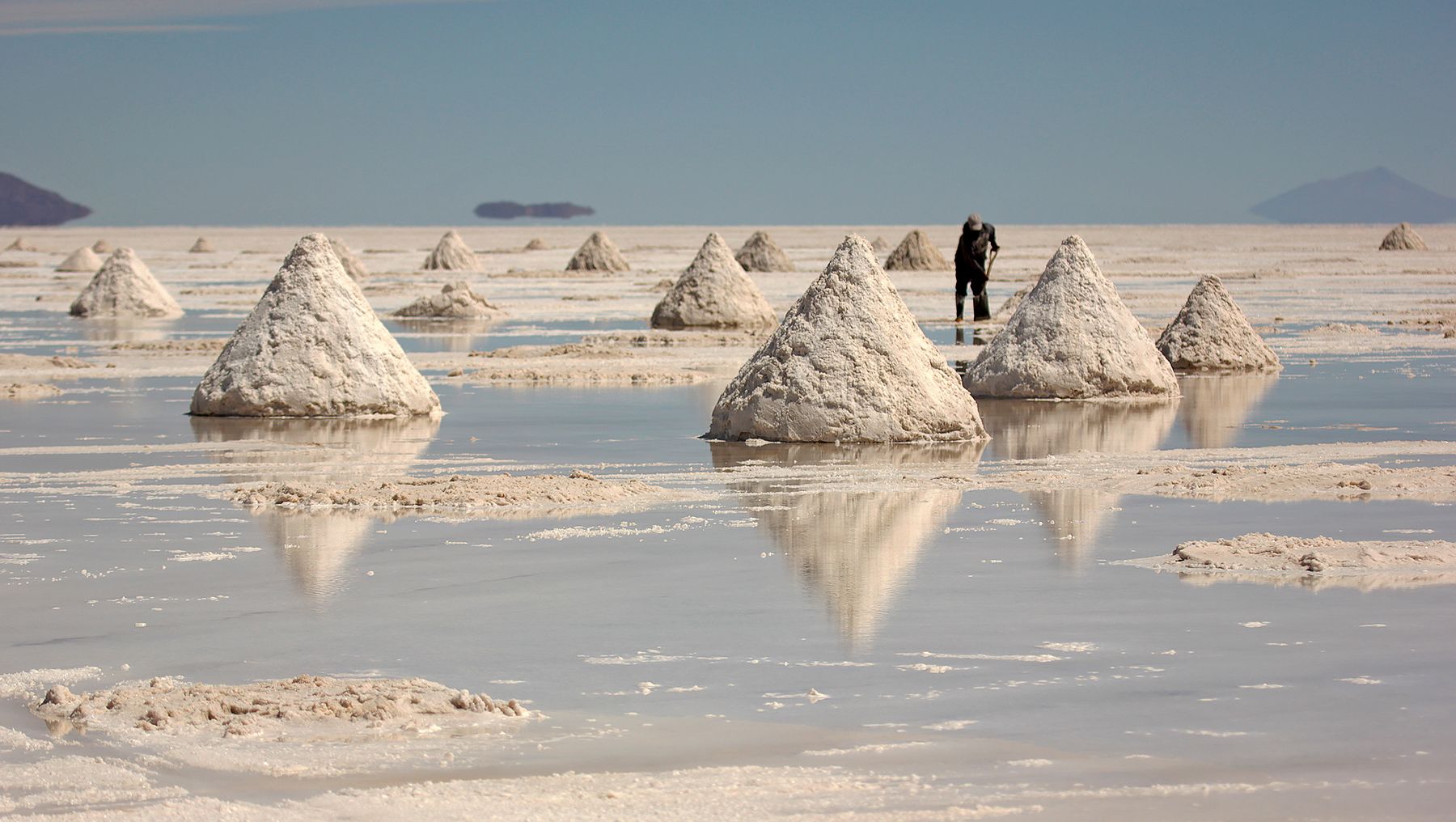 Солончак Уюни в Боливии– самый большой в мире (более 10 тыс кв м). Расположен на высоте 3650 м. Каждый год здесь добывается около 20 тонн соли, а общий запас соли Уюни оценивается в 10 миллиардов тонн. До сих пор только ручной труд. Когда немного спадает вода, превращавшая озеро в сплошное чистейшее по отражательной способности зеркало, с его поверхности с утра до позднего вечера местными жителями собирается соль, из которой и формируются такие пирамидки. Конусы смотрятся очень живописно и привлекают туристов. Но работники совсем им не рады, запрещают фотографировать и даже скандалят.