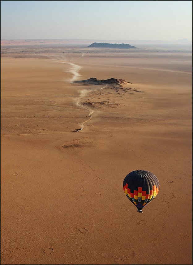Плато Соссусфлей в пустыне Намиб. Внизу видны круглые участки голой земли, которые называют «ведьмины кольца». Они бывают от 2 до 15 м в диаметре и появляются среди травянистой местности. Явление это было открыто ещё в 1971 году, но по сей день приемлемого объяснения ему нет.