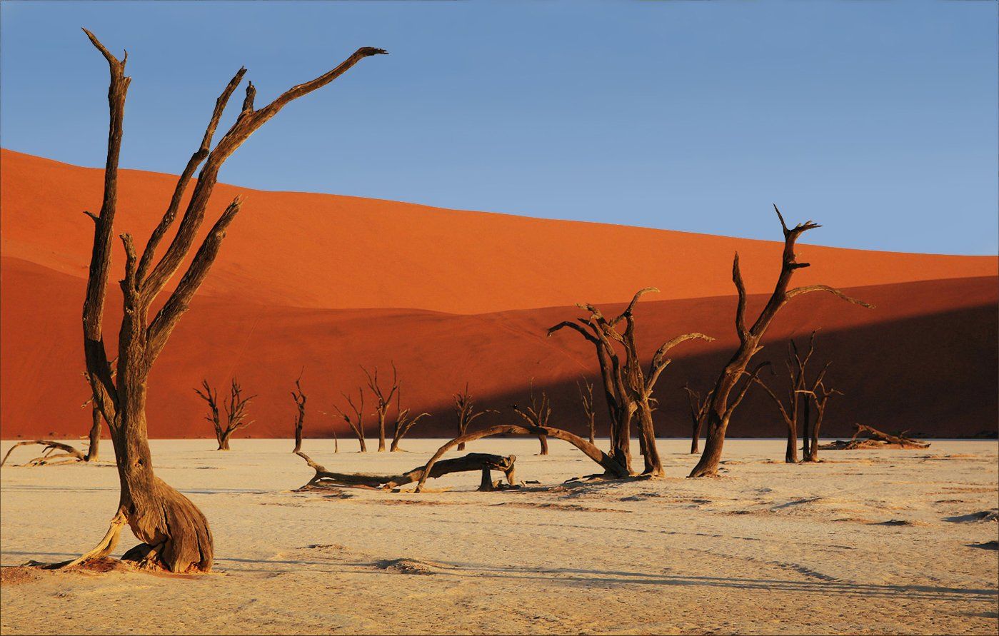 На плато Соссусфлей в пустыне Намиб есть Мертвая долина.. Появилась она много столетий назад, когда дюны преградили русло реки, и деревья медленно умирали без воды…Ровная температура, сухой воздух, полное безветрие – сохранили их остовы до наших дней. Однако меня поразила не только эта долина, но и отношение к ней. Мы туда пропрыгали по глубоким колеям в песке на своем 4х4 в первый вечер. Никого уже не было, только два ворона жутко и зловеще каркали в пустоте. Это была просто мистика – деревья, жившие столько столетий назад.. я благоговейно касалась их кожи..А потом через день мы поехали туда встретить рассвет.. и – о – эти толпы туристов, они галдели, вешали на ветви сумки, выбивали из обуви песок, стуча по стволам, фотографировались: верхом на стволе, верхом на ветке, вися на ветке.. У одной пары спросила – а знают ли они, сколько лет этим деревьям? Нет…о столько…а… Ощущение святотатства, потом мысль: у каждого свой путь.. Но то, что сбереглось сотни лет, так долго уже не протянет…жаль.