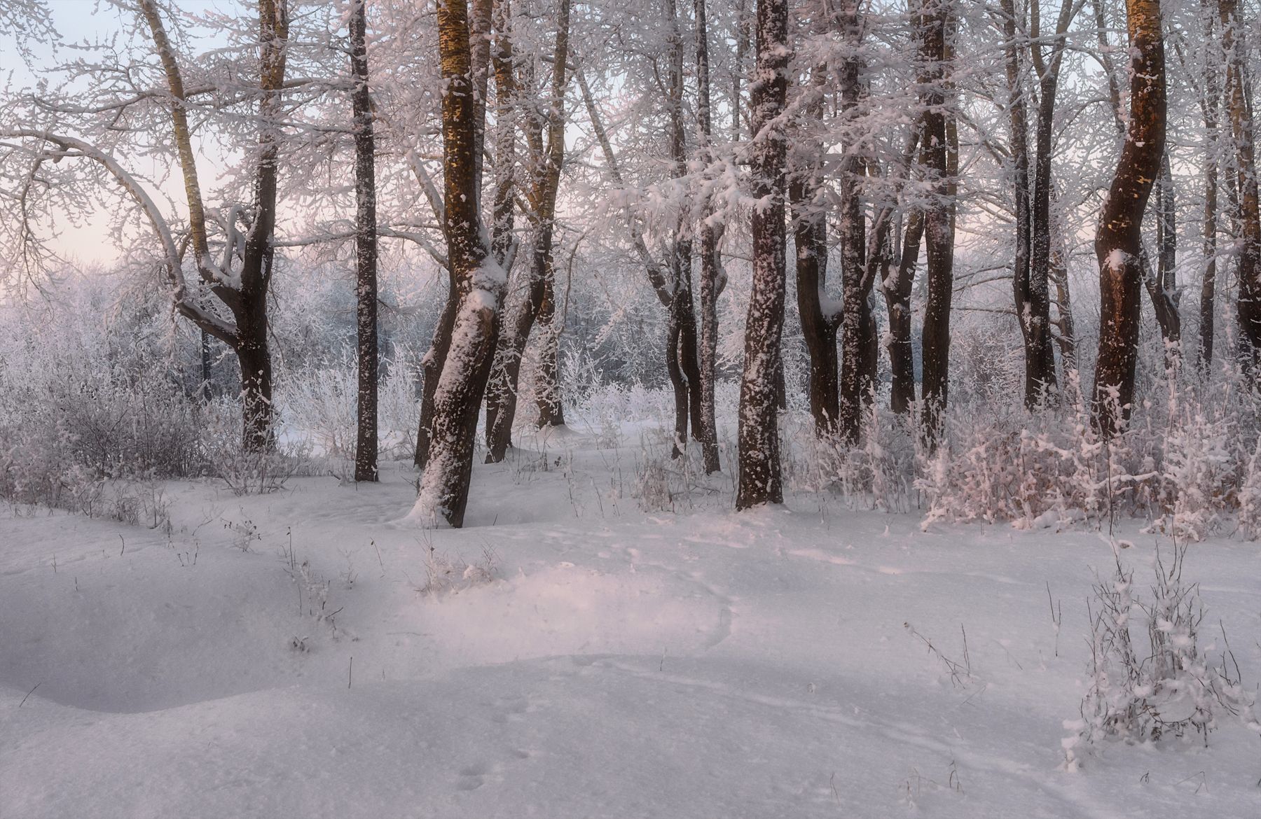 зима, декабрь, иней, мороз, сугробы, деревья, тополя, кусты, вечер, архангельск, Вера Ра