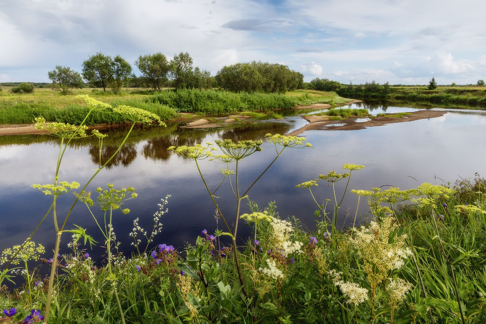 июль лето река сура архангельская область вода отмели берега кусты трава цветы, Вера Ра
