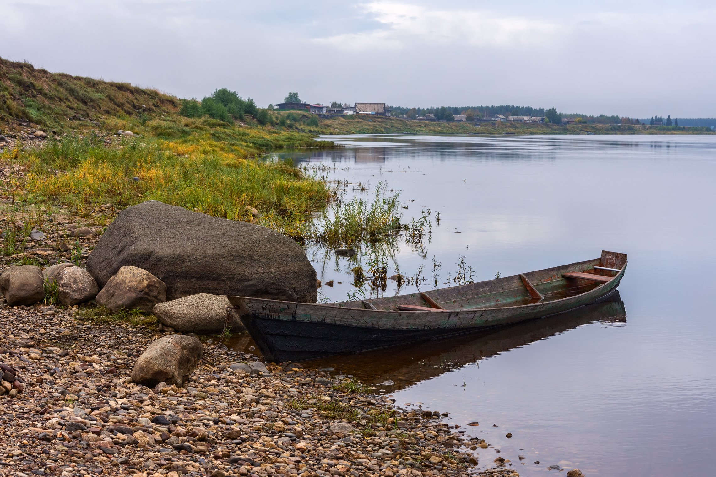 Не слишком ласково встретила нас Пинега этой осенью: хмурым небом, моросящим дождём, порой переходящим в ливень, притихшими деревнями по берегам реки и залитыми дорогами. На ПП лодка, которую на Пинеге называют шитухой, от слова "шить", то есть лодка с нашвами, набоями, не долбленая. Всё реже встречаются такие на реке Пинега, а потому радуешься каждой, как старой знакомой. Пинежский район Архангельской области.
