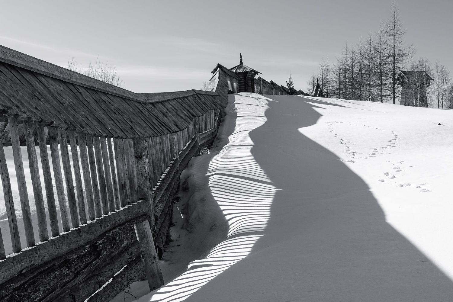 Не знаю , назначения этого сурьёзного заградительного сооружения ,разговор не о нем. Фотографии хороши! Мне больше по душе первая ,более живая , в контрасте тепла древесины изгороди и холодной тени на снегу... Хорошая работа!