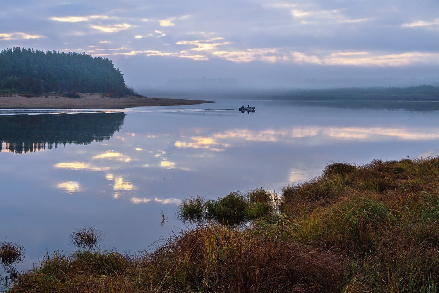 утро река лес берег трава отражения туман лодка, Ра Вера