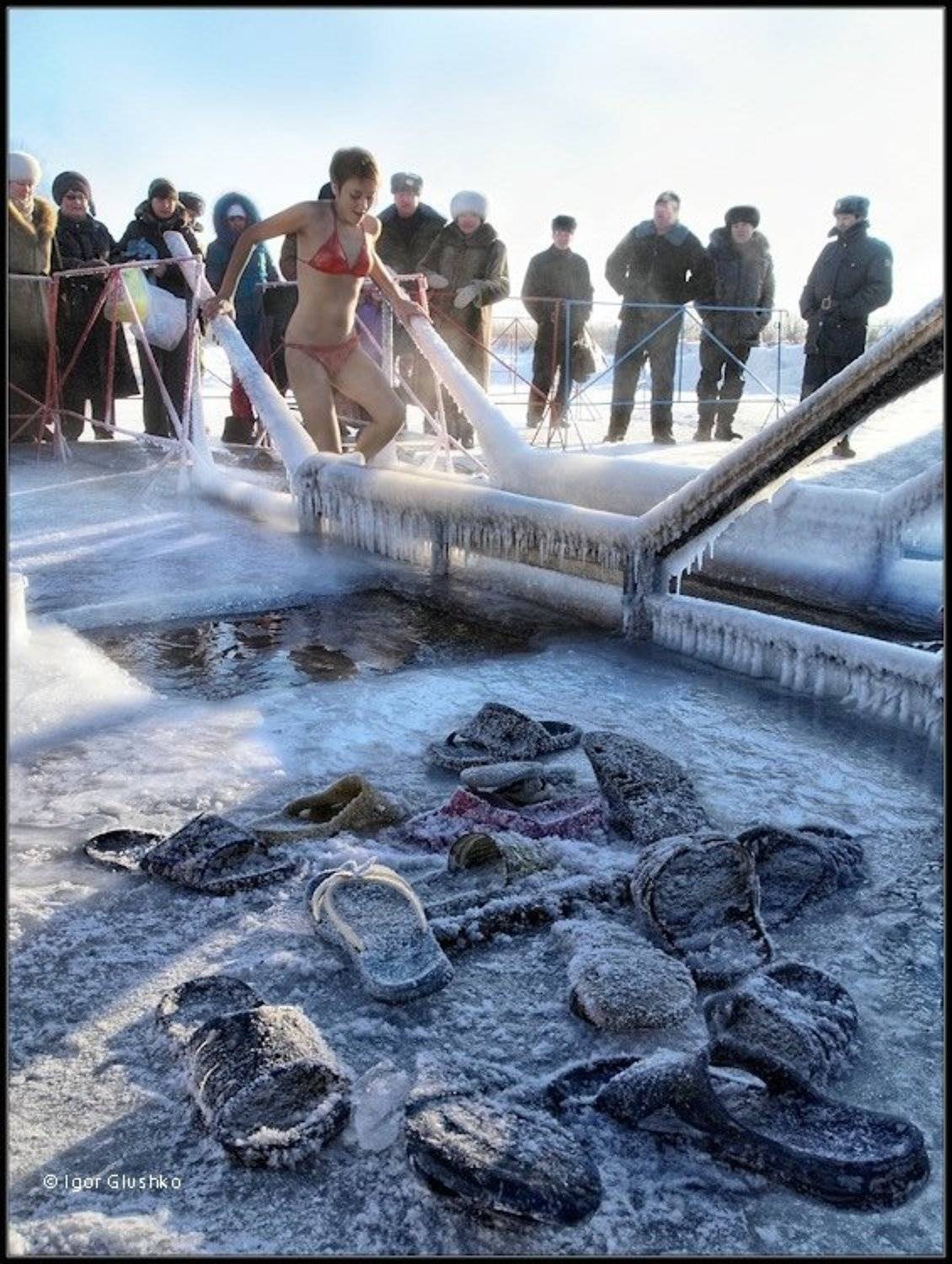 19 января. -26 градусов с ветерком - самое то погреться в проруби! Ведь там вода + 4 градуса! Вот только... выходить из нее "зябко". Да и тапочки, как трофеи, остаются Зиме :)