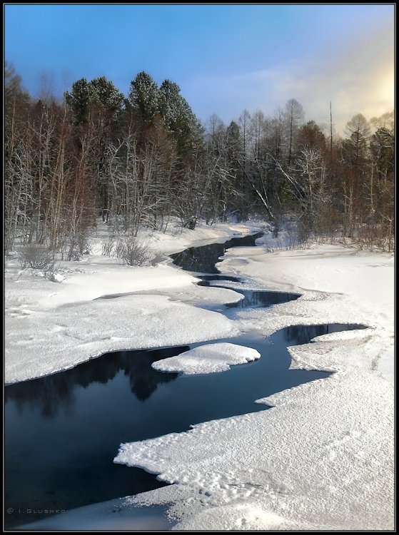 Река Безымянная в марте месяце. Одна из более 300 рек, впадающих в Байкал.