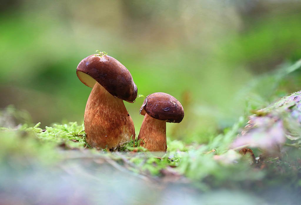 гриб,белый гриб,пара,осень,чаща,листья,ветки,лес,мох,деревья,растения,натура,фон,зеленый,коричневый,красиво,листва,пасмурно., Виктор Шнайдер