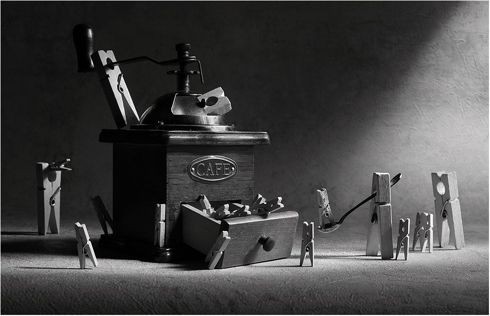 Вик, изумительная работа! У меня была похожая идея с кофемолкой, но другими "героями". А теперь чувствую себя прям безоружной... :)