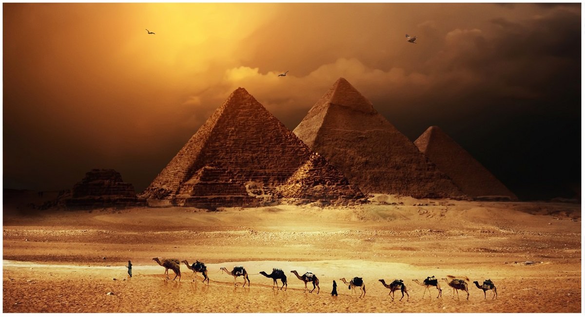 пирамиды, пустыня, караван, закат, Sergii Vidov
