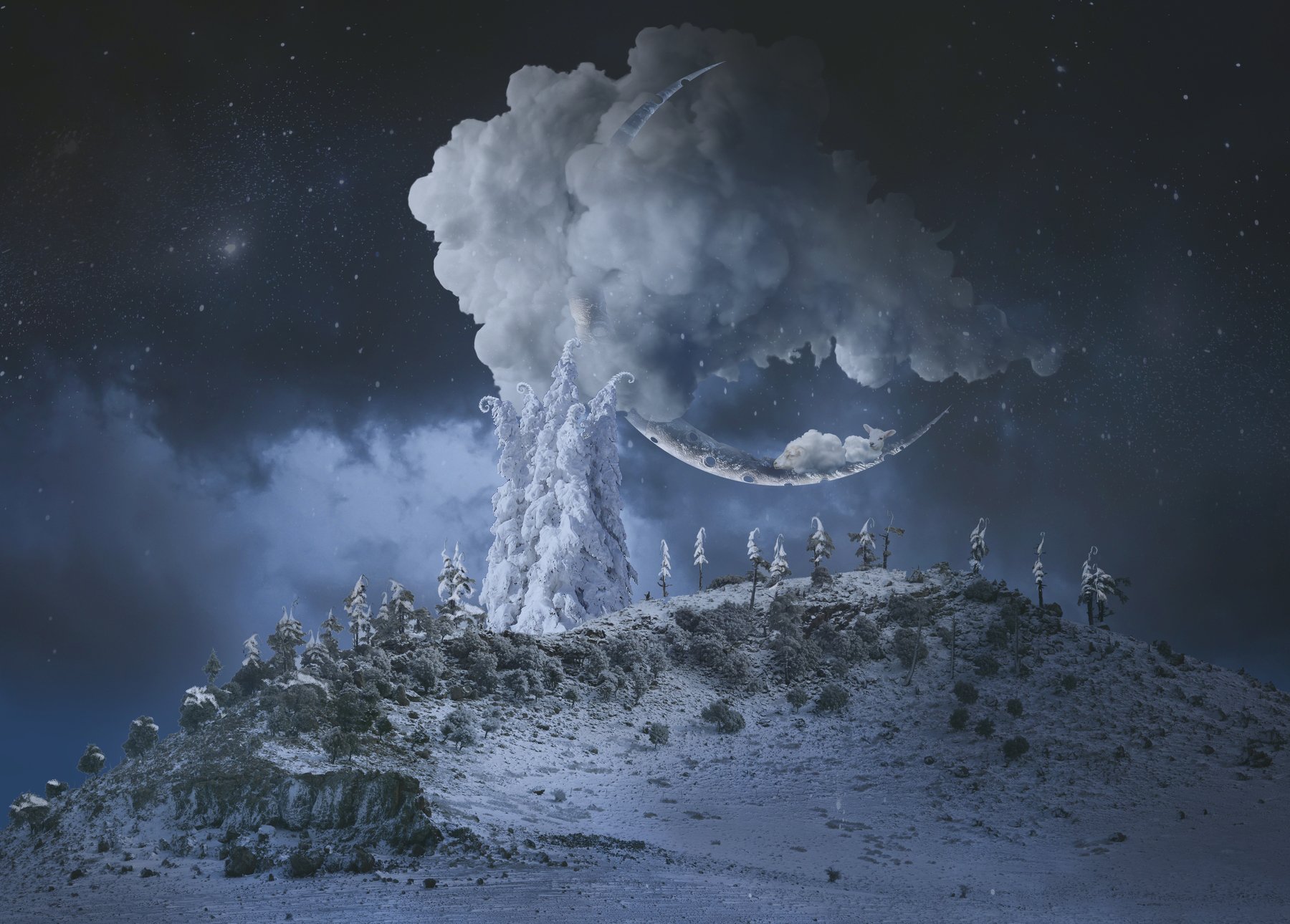 зима, ночь, звезды, месяц, небо, облака, горы, овечки, Sergii Vidov