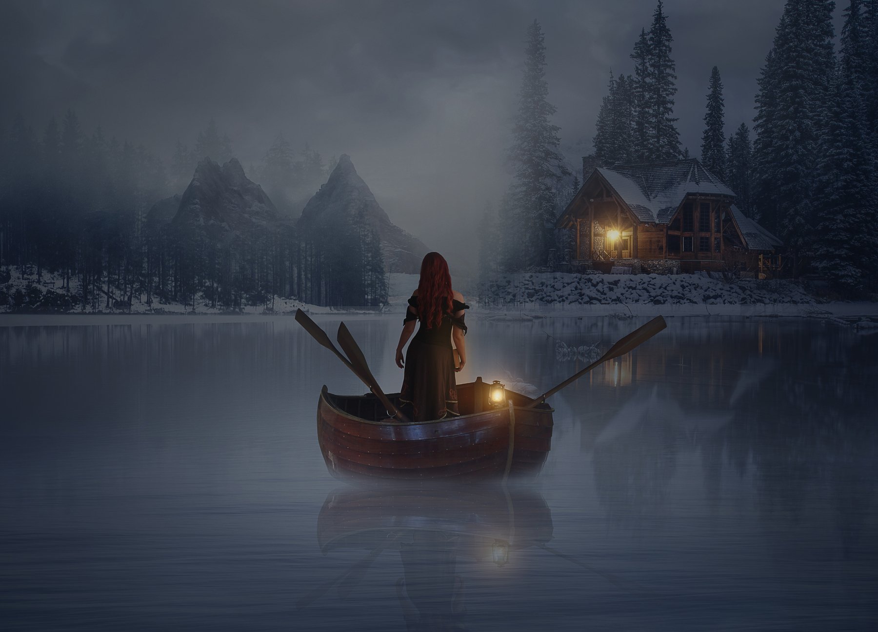 озеро, лодка, девушка, фонарь, лес, Sergii Vidov